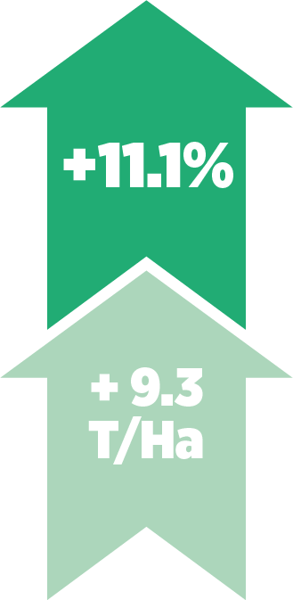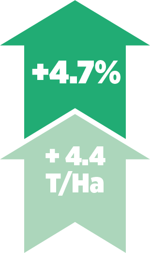 Prouvé dans 6 essais ('22–'24) : +11.1 % de rendement, +9.3 t/ha